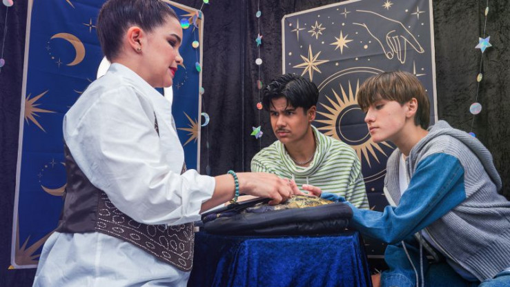 Luna (Marilou Dolores Diana Weilandt, 3. von links) und Sami (Joel Massy Kohandel, 2. von links) lassen sich von einer Wahrsagerin die Sterne deuten.