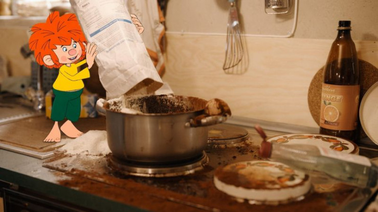 Er wird einfach selbst einen Kuchen backen! Heimlich macht er sich ans Werk. Aber gerade als er Eder mit dem selbstgebackenen Kuchen überraschen will, tauchen dessen Freunde auf. Sie wollen mit ihm feiern. Und haben auch einen Kuchen mitgebracht! Als Eder dann auch Pumuckl versetzt, wird dieser vor Eifersucht rasend. Er zerstört seinen Geburtstagskuchen. Und tritt dabei mit dem Fuß auf die noch heiße Herdplatte.