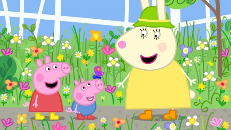 Mama und Papa Wutz gehen mit Peppa und Schorsch (li.) in den botanischen Garten. Frau Löffel (re.) begrüßt sie und führt sie herum. +++ Die Verwendung des sendungsbezogenen Materials ist nur mit dem Hinweis und Verlinkung auf RTL+ gestattet. +++