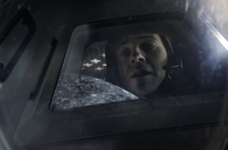 "Apollo 11"-Astronaut Michael Collins betrachtet aus einem Fenster des Kommandomoduls die Mondoberfläche (Reenactment).