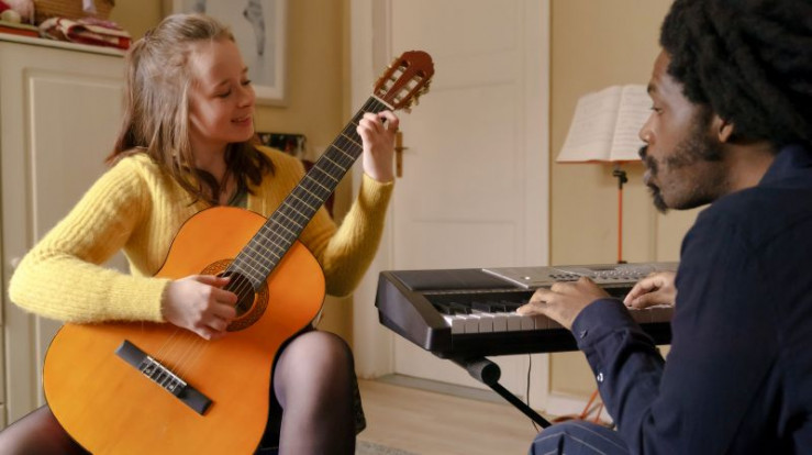 "Tina mobil" erzählt von den täglichen Problemen und Sorgen einer dreifachen Mutter in Pankow. Der Kampf ums Überleben, das mangelnde Geld - aber Tinas Maxime ist: Man kann alles schaffen, was man will. Und wenn man es nicht schafft, hat man es eben nicht genug gewollt. - Julia (Fine Sendel) in ihrem Element: Gitarrenstunde mit ihrem Lehrer Ray (Joel Holmes).