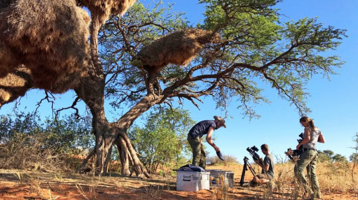 Das Film-Team der Text und Bild Medienproduktion bei den Dreharbeiten in der südlichen Kalahari unter einem riesigen Siedelweber Vogelnest.