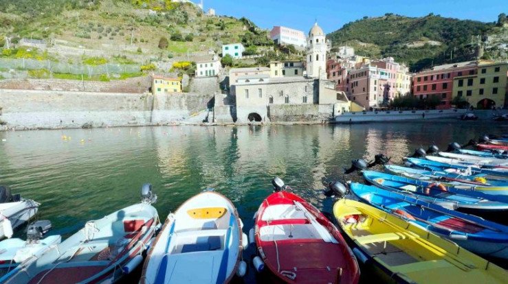 Bunte Fischerboote schaukeln im Hafen von Vernazza - eingerahmt von pastellfarbenen Häusern, steilen Weinterrassen und der markanten Kirche Santa Margherita d?Antiochia.