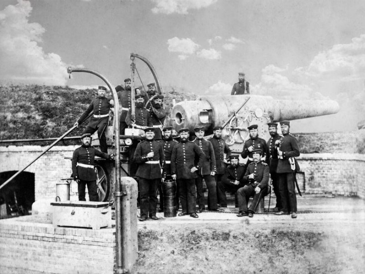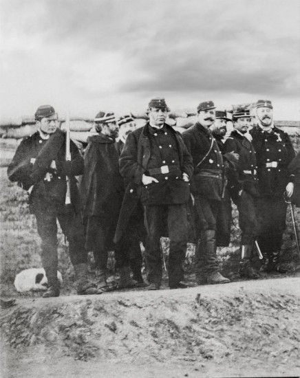 Der preußische Große Generalstab in Versailles, November 1870. In der Mitte General Helmuth von Moltke, fünfter von rechts in der unteren Reihe Oberstleutnant Paul Bronsart von Schellendorff, dessen Kriegstagebuch durch die dritte Episode führt.