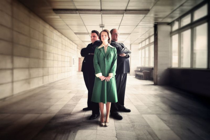 Franz-Josef Strauß (Paul Sedlmeir, l.) und Helmut Kohl (Jan van Weyde, r.) brauchen Hilfe. Sekretärin Frau Müller (Nora Islei, M.) muss die beiden politischen Schwergewichte wieder aus dem Schlamassel ziehen.