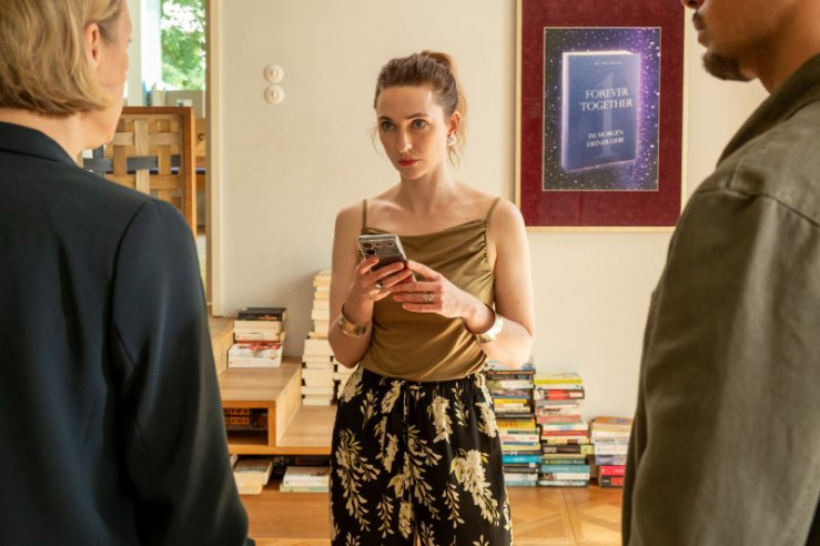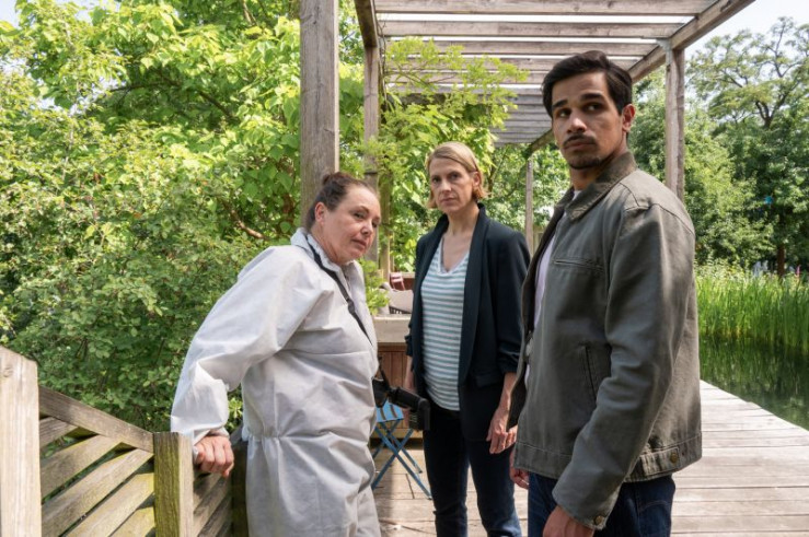 In der Villa der Toten hatte ihre Assistentin Clara Treppke (Hannah Ehrlichmann, l.) ihr Büro. Samir Amari (Skandar Amini, r.) und Tamara Meurer (Anja Pahl, M.) befragen sie nach ihrem Verhältnis zu ihrer Chefin und ihrem Alibi.