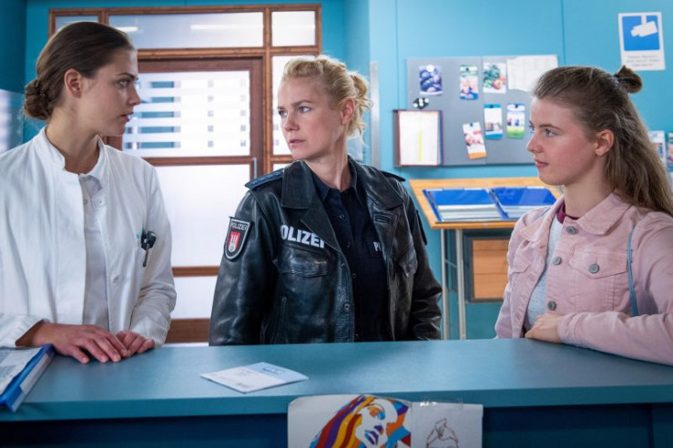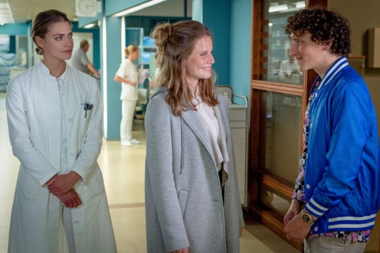 Dr. Grünberg (Laura Berlin, l.) erklärt Franzi (Rhea Harder-Vennewald, M.) und ihrer Tochter Emma (Sina Michel, r.) , dass Sandra Heinemann unbedingt gefunden werden muss. Das Aneurysma in ihrem Kopf ist lebensbedrohlich.
