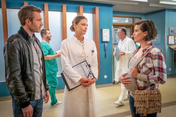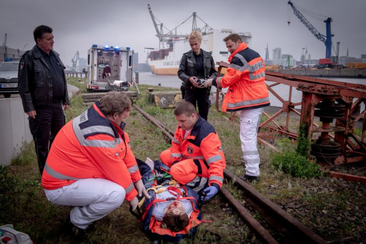 Franzi (Rhea Harder-Vennewald, r.) will von Nino (Jonathan Ohlrogge, 2.v.r.) wissen, wie es zu seinem Unfall auf dem Hafengelände gekommen ist. Benno Höft (Max Engelke, l.) und Steffi Gebhardt (Julia-Maria Köhler, 2.v.l.) sind bei ihm.