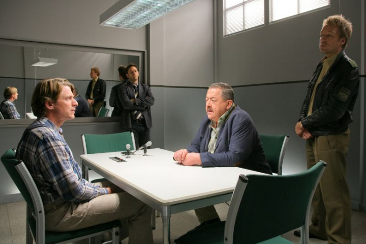 Theo Behrens (Herbert Ulrich, l.) wird von den Kommissaren Sebastian König (Mark-Alexander Solf, 2.v.l.) und Korbinian Hofer (Joseph Hannesschläger, 2.v.r.) näher befragt. Polizist Michael Mohr (Max Müller, r.) hört den Aussagen zu.