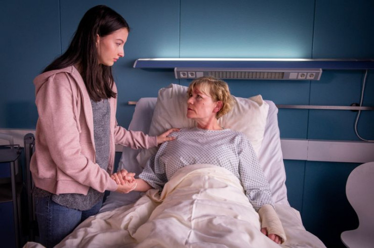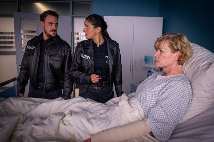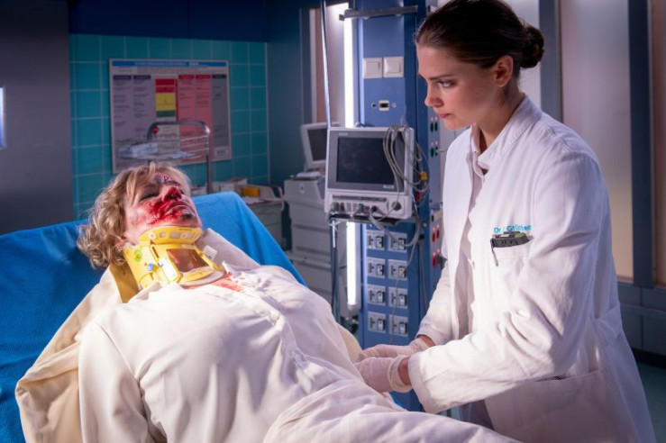 Dr. Haase (Fabian Harloff) versorgt Karin Berger (Anne Kasprik), die bei einem Überfall schwer zusammengeschlagen wurde.