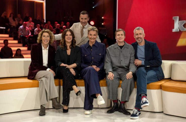 Moderator Kai Pflaume (M.) mit Adele Neuhauser, Katarina Witt, Franziska van Almsick, Till Reiners und Sebastian Pufpaff (v.l.).