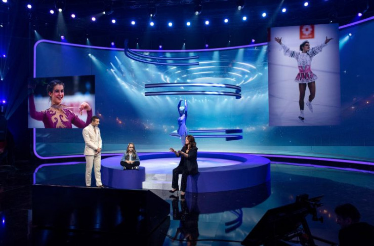 Kai Pflaume, Fiorella (10) und Katarina Witt (v.l.) beim Eislaufspuren-Duell