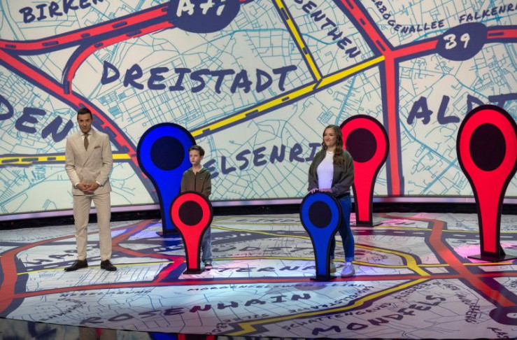 Kai Pflaume, Noah (10) und Marie-Louise Finck (v.l.) beim Straßennetz-Duell