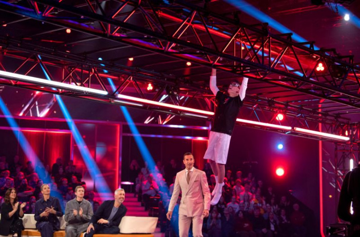 Kai Pflaume (l.) und Adam (12) beim Klimmzug-Duell