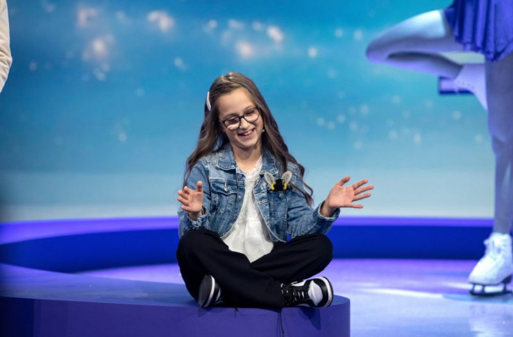 Fiorella (10), Kai Pflaume und Katarina Witt (v.l.) beim Eislaufspuren-Duell
