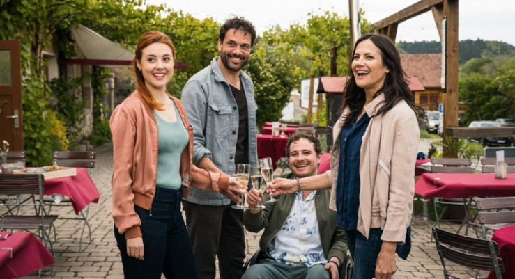 Julia Kramer (Meriel Hinsching, li.) und ihr Bruder Leo (Matti Schmidt-Schaller, 2. v. re.) stoßen mit Steffen (Kai Schumann) und Maja (Bettina Zimmermann) an.