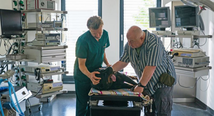 Dr. med. Vet. Sebastian Pfeifer (Max von Pufendorf, li.) behandelt den Hund von Thomas Ohlig (Christoph Müller).