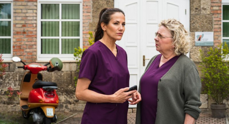 Dr. med. Vet. Maja Freydank (Bettina Zimmermann) und Uta Helmreich (Ramona Kunze-Libnow, re.) stehen vor der Praxis.