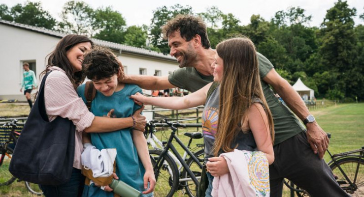 V. li. n. re.: Maja (Bettina Zimmermann) drückt ihren Sohn Louis (Wanja Valentin Kube) nach dem erfolgreichen Fussballspiel. Steffen (Kai Schumann) und Greta (Nelly Hoffmann) freuen sich mit.
