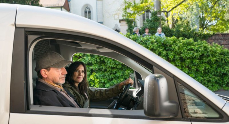 Onkel Bodo (Thorsten Merten) und Dr. med. Vet. Maja Freydank (Bettina Zimmermann) parken vor dem Friedhof.