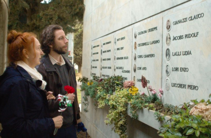 Claudia Höft, Enkelin von Rudolf Jacobs, und Schwiegersohn Benjamin Hansen am Grab von Rudolf Jacobs in Sarzana.