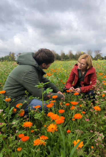 Frank Seibert (links) und Agrarwissenschaftlerin Astrid Sprenger (rechts) beim Ernten der Calendula (Ringelblume) auf dem Feld von Weleda bei Schwäbisch Gmünd. Sprenger ist die Leiterin des Heilpflanzengartens von Weleda bei Schwäbisch-Gmünd.