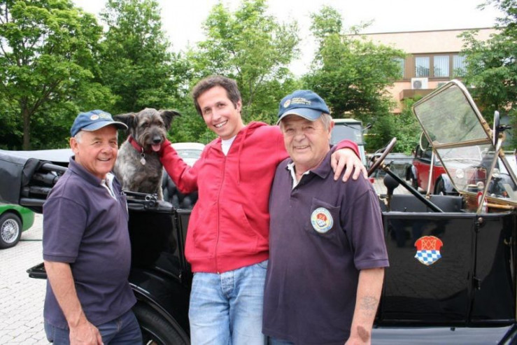 Willi (Mitte) mit Josef Auer (links), Rudi Batzer und Hund Anka vor dem Ford Thin Lizzy der Oldtimerfreunde Oberschleißheim.