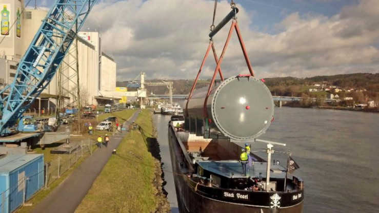 Wenn es an Land nicht weitergeht, müssen die Industrieöfen zu Wasser transportiert werden.