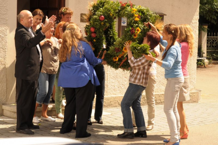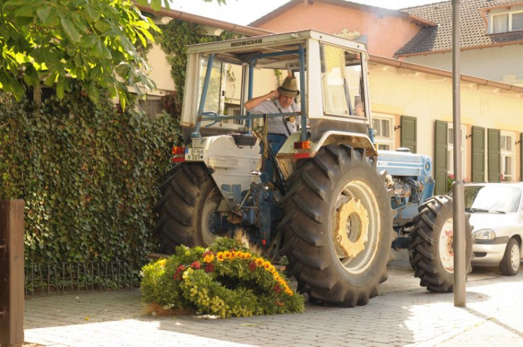 Die Landfrauen müssen sich von Schattenhofer sagen lassen, dass ihr Erntedank-Korb geradezu lächerlich wirkt neben der gigantischen Erntekrone der Wangener.
