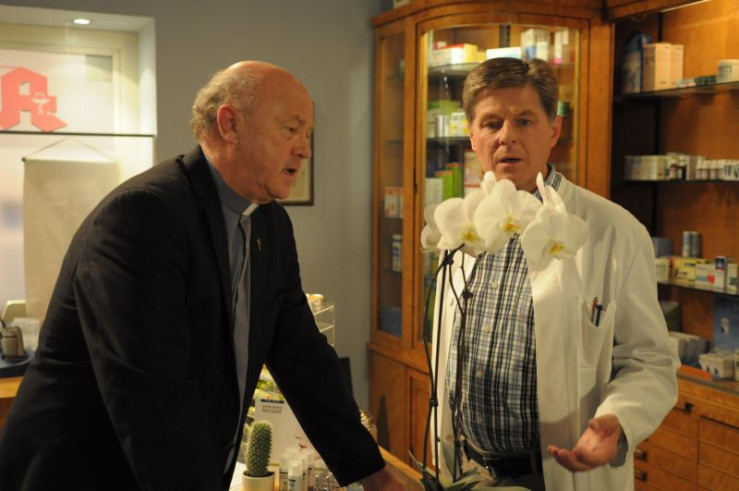 Der Pfarrer versteht Bambergers Bitte falsch und glaubt, dass er selbst ein Problem hat und die Pflanze nur vorschiebt. Von links: Pfarrer Kurz (Hans Stadlbauer) und Roland Bamberger (Horst Kummeth).