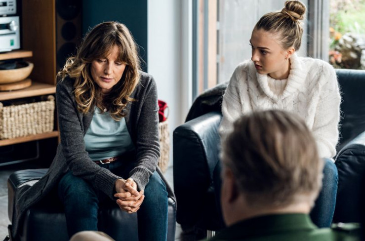 Was weiß Elisabeth Schulz (Elisabeth von Koch, links), die Mutter von Janina Schulz (Lilly Krug, rechts), über den Toten Arno Heinrich? Girwidz (Michael Brandner, vorne) befragt die beiden.