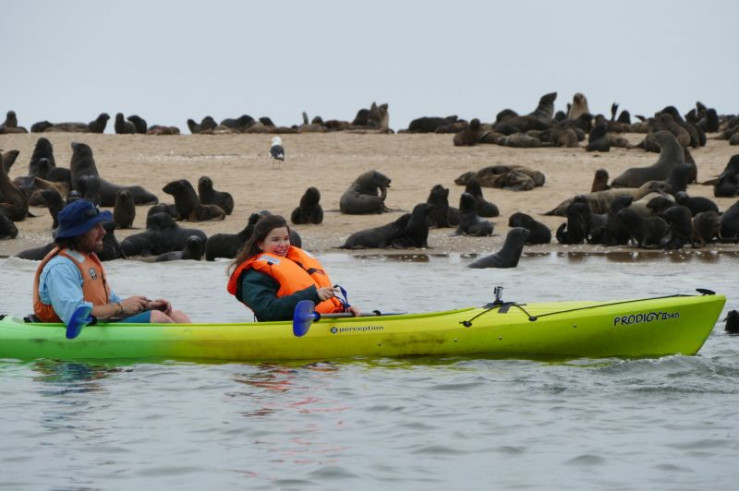 Und weil Robben die meiste Zeit im Wasser verbringen, steigen Anna und Naude in der Walfischbucht in ein Kajak. Mitten drin in der Robben-Meute, werden sie von den Tieren ordentlich nass gespritzt.