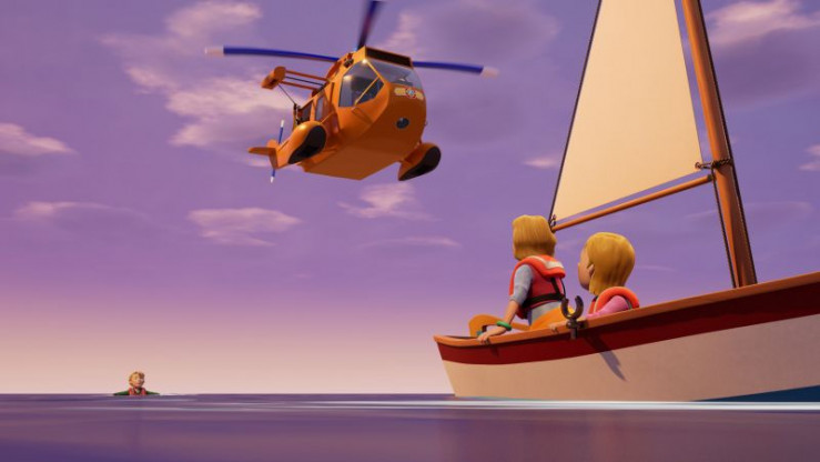 Feuerwehrmann Sam behält die Nerven und fordert Unterstützung aus der Luft an.