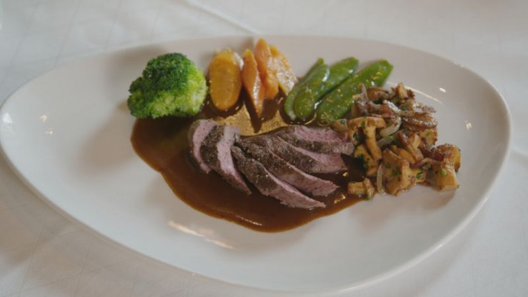 Hauptspeise der Schweizer Wirtin in Schlegldorf: Rehrücken auf Wacholderrahmsauce mit Gartengemüse, Pfifferlingen und Topfenspätzle.