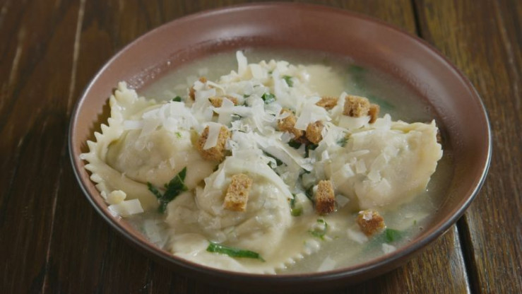 Hauptspeise vom Gasthaus Wallerei am Walchensee: Ravioli mit Kohlrabifüllung in einer Weißweinsauce.