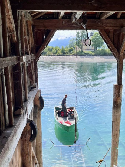 Fischer Kilian Böhm kommt mit seinem Fang aus dem Bootsanleger am Walchensee.