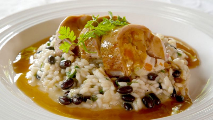 Gefüllter Kaninchenrücken auf Risotto mit schwarzen Bohnen und Gartenkräutern. Hauptgericht im Jägerwirt in Kirchbichl.