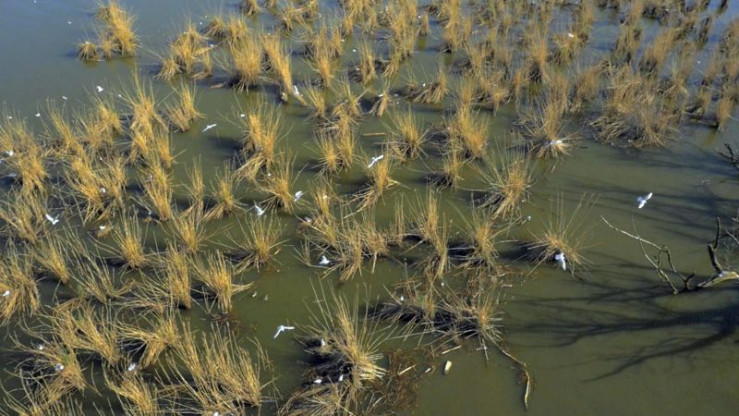 Luftaufnahme: Lachmöwen suchen Material zum Nestbau.
