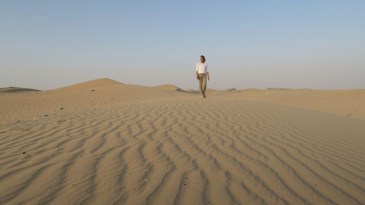 ARD-Journalistin Lena Ganschow in der Wüste der Vereinigten Arabischen Emirate. Regen fällt fast ausschließlich in den Wintermonaten. Die Zahl der Regentage pro Jahr liegt bei nur fünf bis sieben.