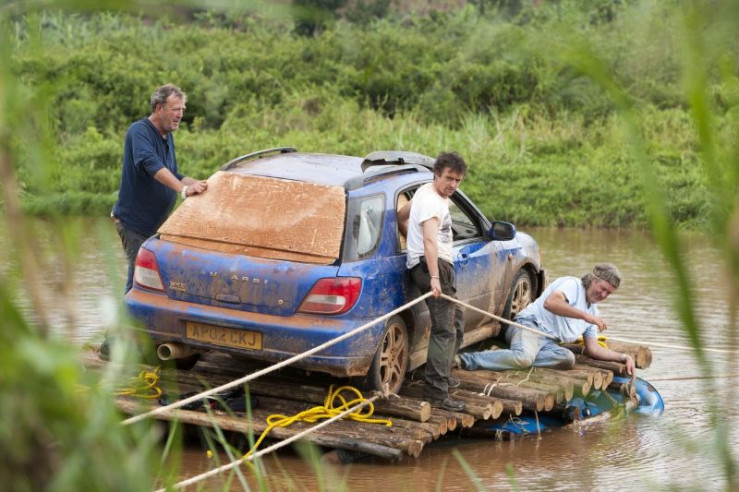 Jeremy Clarkson, Richard Hammond und James May (v.l.) versuchen mit Richards Subaru Impreza WRX estate den Fluss zu überqueren.