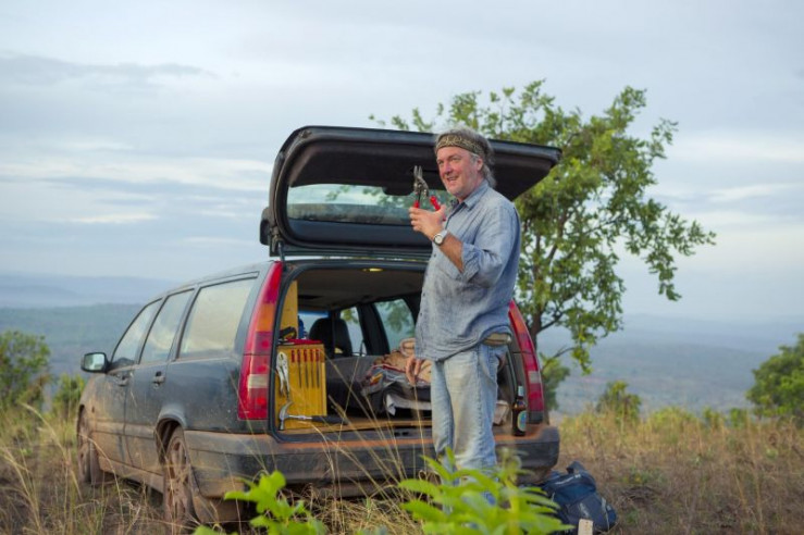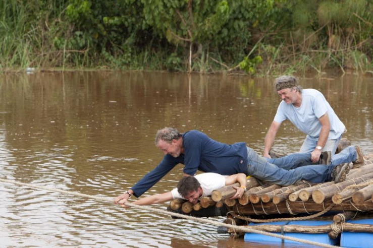 Jeremy Clarkson (l.), Richard Hammond (vorne) und James May testen in Tansania ihr Autofloß.