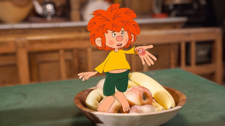 Neugierig sieht sich Pumuckl in der Wohnung um. Äpfel mit Apfelaufkleber, ein Stoffhund und ein Klavier erregen seine Aufmerksamkeit. Eder braucht zusätzliches Werkzeug. Pumuckl bleibt in der Wohnung und klimpert fasziniert auf dem Klavier herum.