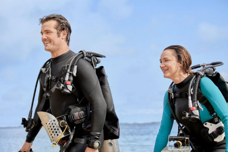 Während der Vorbereitung der Hochzeit ihrer Schwester verliert Addy (Hunter King, re.) den Ring ihrer Großmutter in den Gewässern von Hawaii. Um ihn wiederzufinden, bittet sie den Taucher Jack (Beau Mirchoff, li.) um Hilfe und verliebt sich in ihn.