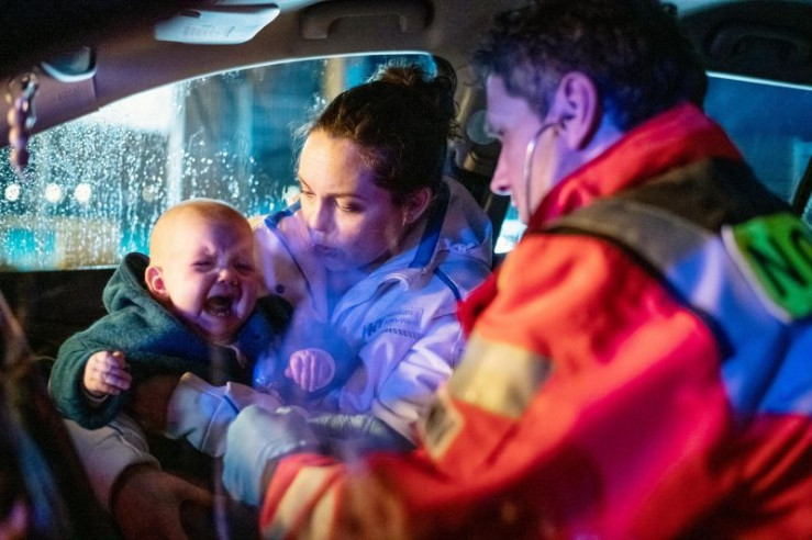 Ella (Ines Quermann, M.) und Dr. Sebastian Sander (Oliver Franck, r.) haben Baby Felix (Marlene Hofmann, l.), der die halbe Nacht alleine und hilflos in der Babyschale des sturmgeschüttelten Autos verbracht hat, gerettet und untersuchen ihn.
