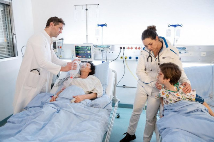 Während Ella (Ines Quermann, 2.v.r.) den besorgten Emil (Manuel Santos Gelke, r.) zu beruhigen versucht, kollabiert Tinas (Aimée Gneist, 2.v.l.) Lunge. Dr. Sebastian Sander (Oliver Franck, l.) hält eine zweite OP für notwendig.
