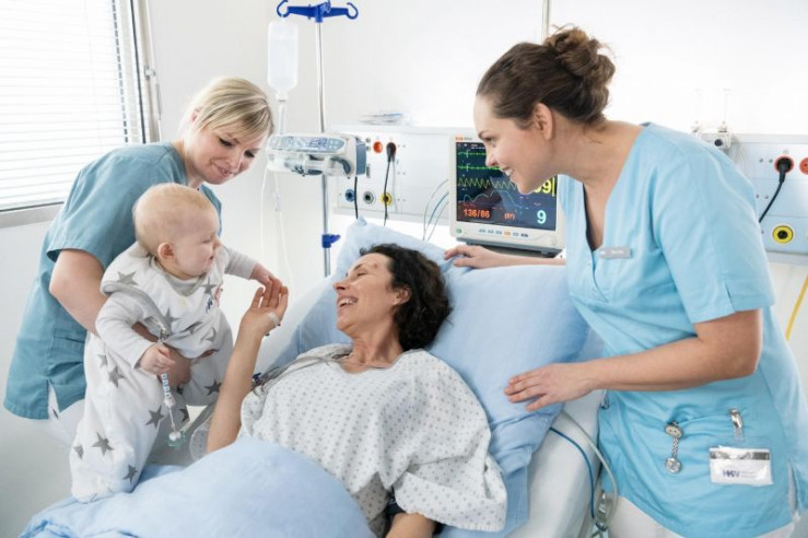 Krankenschwester Heidi (Elisabeth Hofmann, l.) und Ella (Ines Quermann, r.) bringen Patientin Tina (Aimée Gneist, M.) ihren Sohn Felix (Marlene Hofmann) zurück.