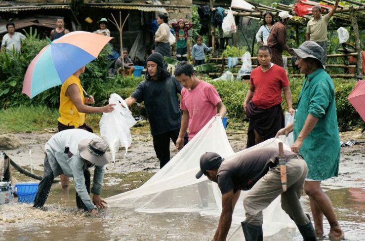 Mönche beim Ritual für die Rettung der Fische.