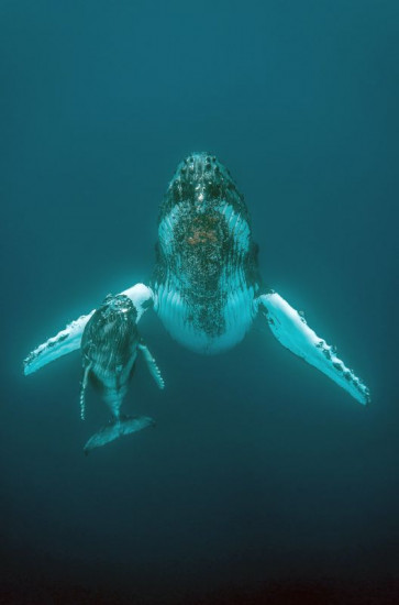 Ein Taucher filmt einen Buckelwal mit Kalb.