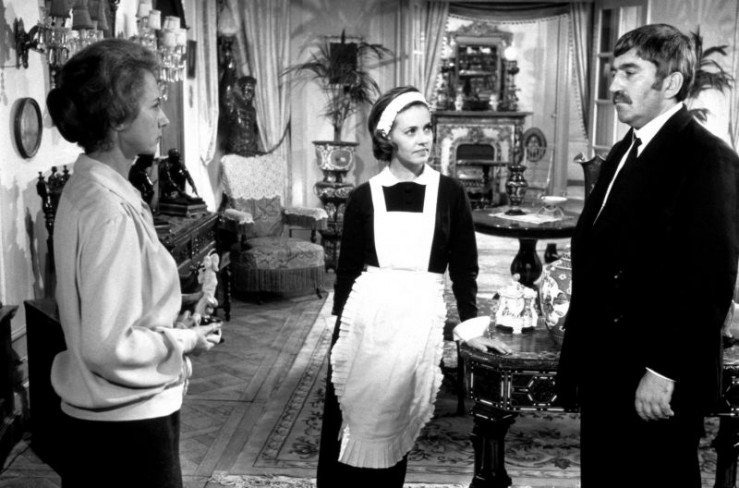 Hausmädchen Célestine (Jeanne Moreau, Mi.) im Wohnzimmer ihrer Herrschaft Madame (Françoise Lugagne, li.) und Monsieur Monteil (Michel Piccoli, re.)