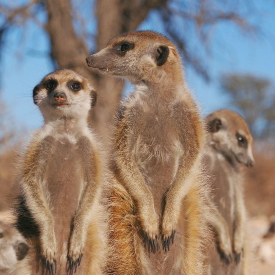 Erdmännchen wärmen sich im Morgengrauen an den Sonnenstrahlen. Auf den Hinterbeinen stehend, bieten sie der Sonne die größtmögliche Körperoberfläche zur Wärmespeicherung. Dieser Clan besteht aus 15 Individuen, die alle Mitglieder der gleichen Familie sind.